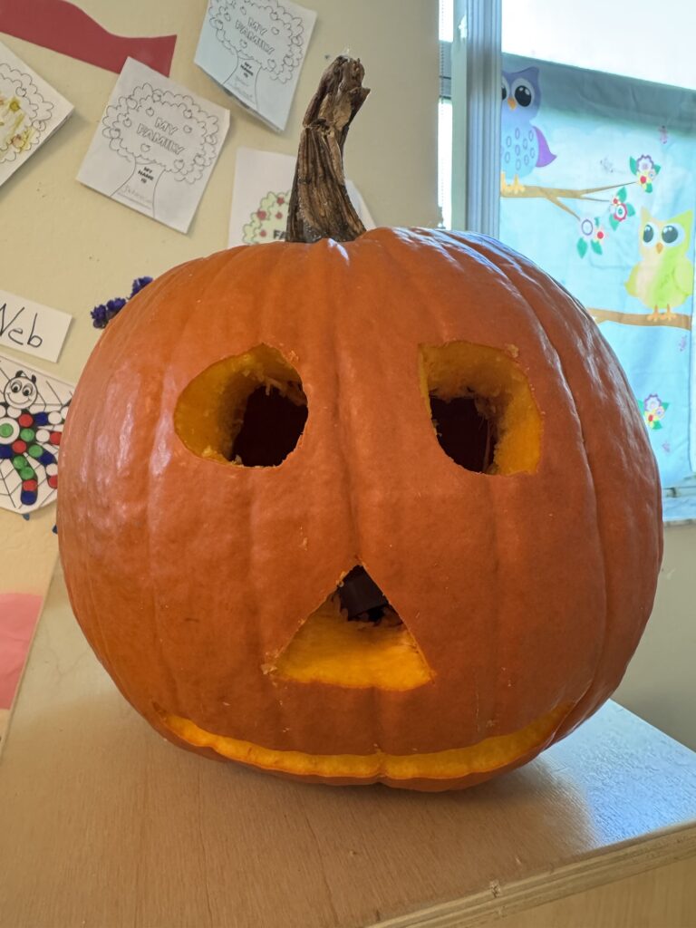 My students made a Jack-O-Lantern during Science yesterday. First they had to sequence the steps to creating a Jack-O-Lantern. They participated in touching the pumpkin and the stem. They watched me cut out the stem. All 7/10 (3 were absent) put their hands inside the pumpkin and pulled out the strings and seeds. No one got upset over the smell or feel which was so surprising to me. A vote was taken and “round” eyes were chosen. They wanted to eat the pumpkin seeds(beans), but they were dirty so I didn’t let them.